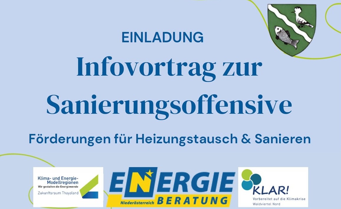 Die Gemeinde Reingers ist eine “Raus aus Öl”-Gemeinde und gemeinsam mit der KEM Thayaland und der KLAR! Waldviertel Nord laden wir zu einem Infoabend rund um die Themen Förderungen, Sanierungen und Heizungstausch ein.