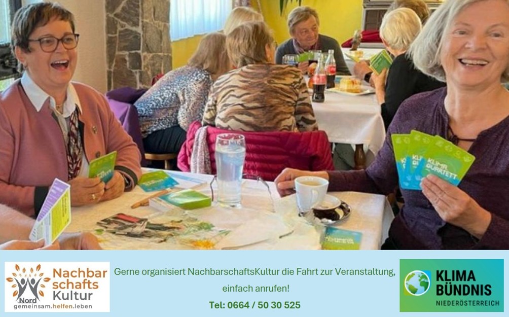 Klimaschutz betrifft uns alle, unabhängig davon wie jung oder alt wir sind. An diesem Nachmittag erwarten Sie spannende Karten- bzw. Gesellschaftsspiele. Durchs Programm geführt werden Sie durch Referent:innen vom Klimabündnis NÖ. Das gemütliche Beisammensein bei einer Jause und der gemeinsame Spaß stehen im Mittelpunkt des Nachmittags.