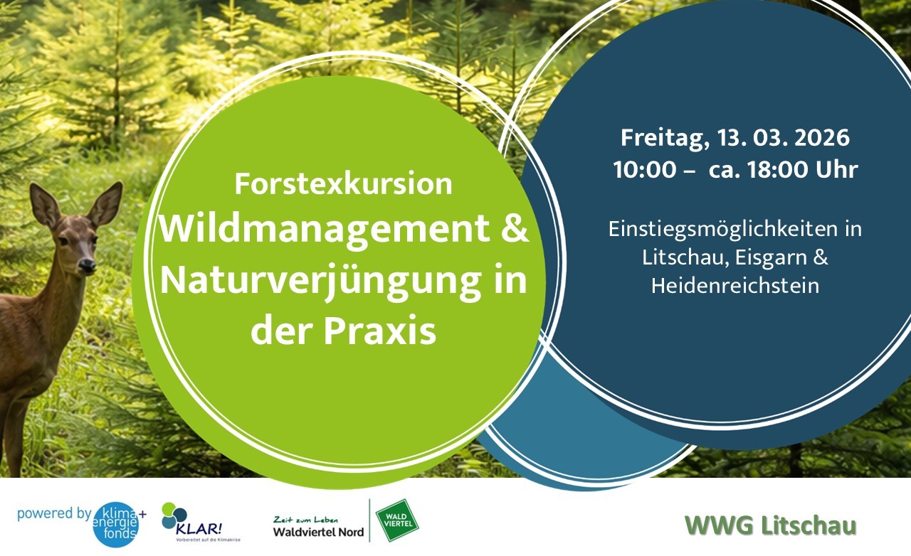 Im Mittelpunkt der Exkursion am Freitag, 13. März 2026 stehen das Zusammenspiel von Wildmanagement und Naturverjüngung sowie die forstliche Praxis im Umgang mit Wild. Anhand konkreter Beispiele werden erprobte Strategien zur Ermöglichung von Naturverjüngung, zur Lebensraumgestaltung und zur Reduktion von Wildschäden vorgestellt.